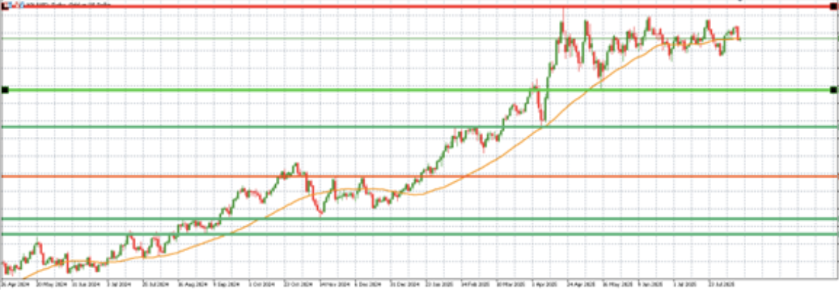 Gold prices surged following the release of the latest U.S. Consumer Price Index (CPI) data, which showed no change month-over-month (m/m), remaining at 0.2%. Despite expectations that trade tariffs would exert upward pressure on inflation, the data suggests that these tariffs are not having the dramatic impact many had anticipated. This market development, along with rising expectations of a Federal Reserve rate cut, has contributed to gold’s rise to $3,354 per ounce, with the next resistance level seen at $3,500.